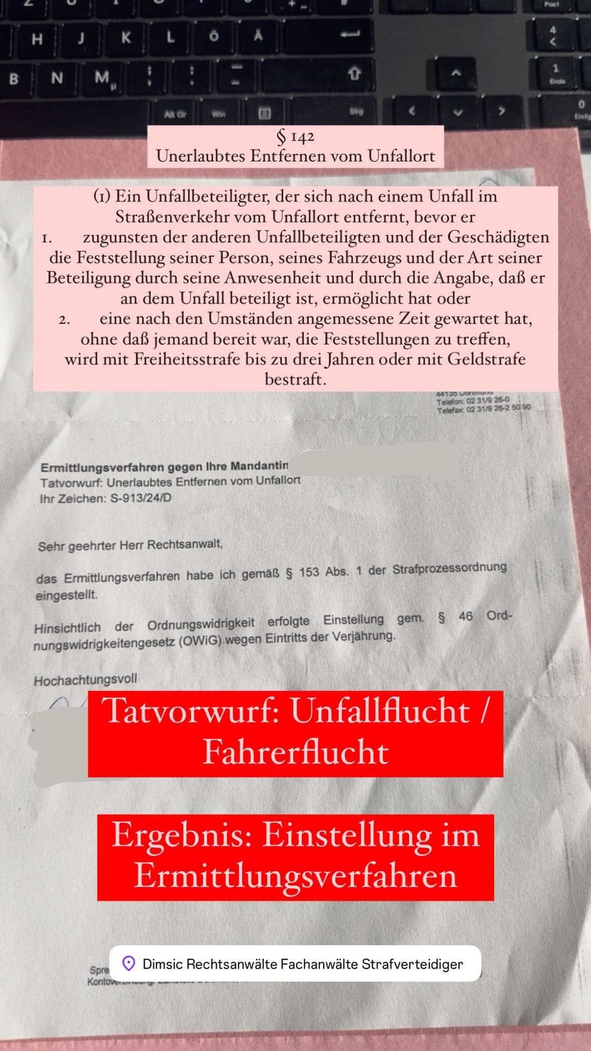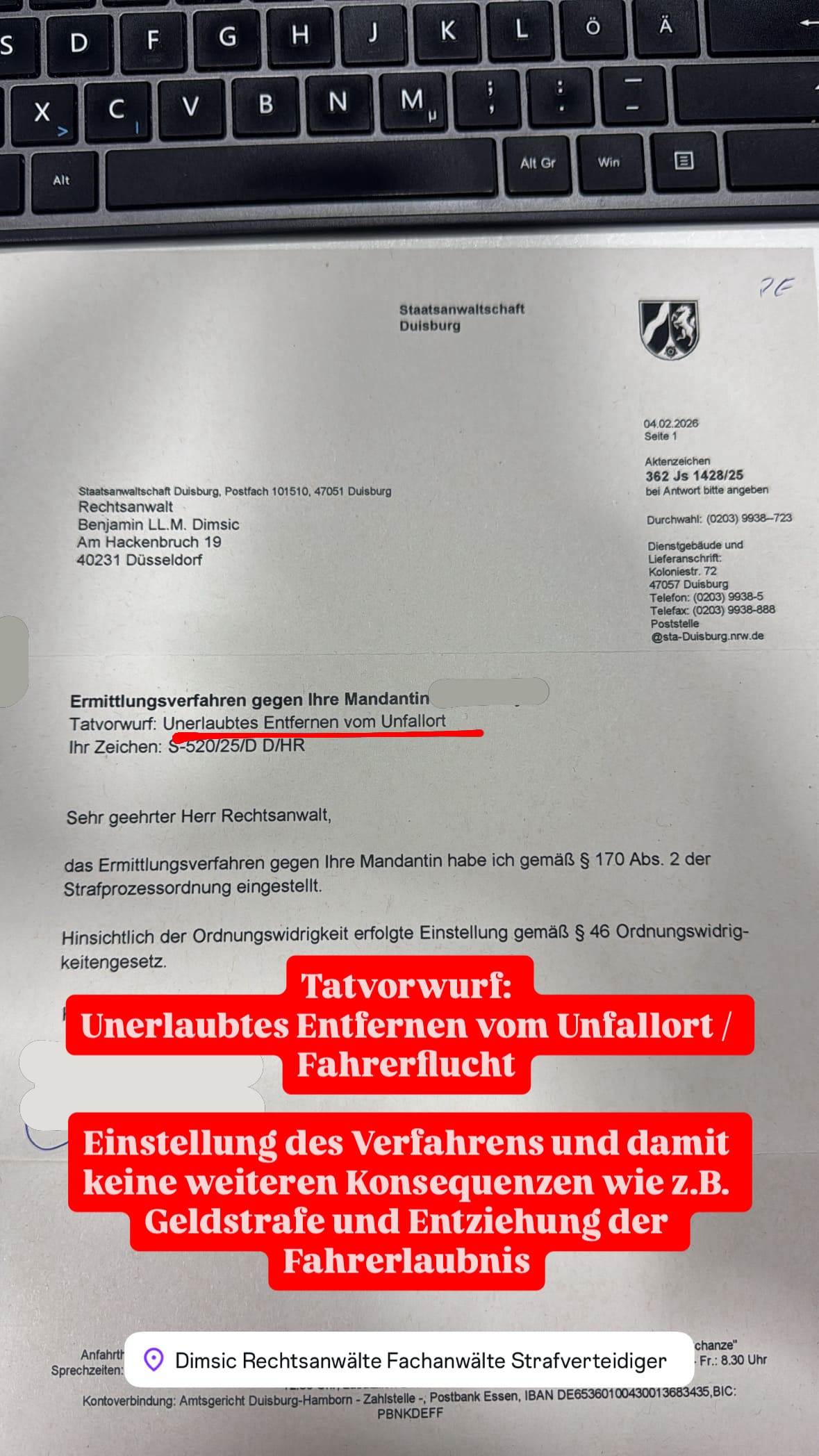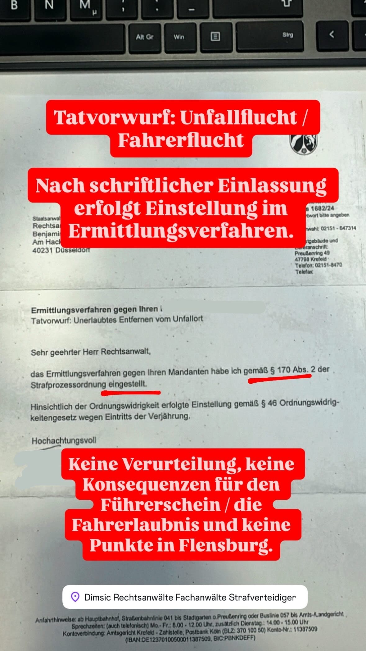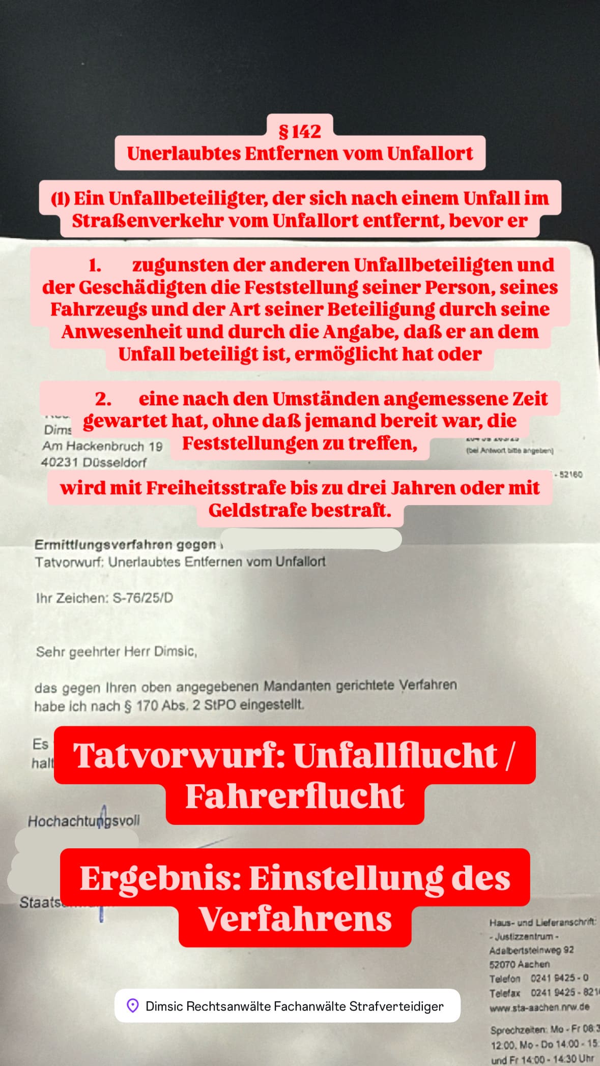 Anwalt für Strafrecht & Strafverteidiger B. Dimsic, LL.M. aus Düsseldorf verteidigt seit mehr als 15 Jahren im Verkehrsstrafrecht und beim Tatvorwurf Fahrerflucht und erzielt regelmäßig die bestmöglichen Ergebnisse – sowohl außergerichtlich im Ermittlungsverfahren als auch vor Gericht nach Anklage oder Strafbefehl.