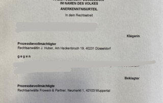 Rechtsanwältin und Fachanwältin für Arbeitsrecht J. Huber aus Düsseldorf begleitet seit Jahren arbeitsrechtliche Fälle im Arbeitsrecht und kann auf eine jahrelange Erfahrung aus der prozessualen Vertretung, sowohl vor dem Arbeitsgericht Düsseldorf und Landesarbeitsgericht Düsseldorf, als auch bundesweit an allen Arbeitsgerichten, Landesarbeitsgerichten bauen. Ein Fachanwalt für Arbeitsrecht hat eine nachgewiesene Expertise im Arbeitsrecht und ist durch den Nachweis theoretischer Kenntnisse und eine große Anzahl von arbeitsrechtlichen Fällen aus der Praxis berichtigt den Titel Fachanwalt für Arbeitsrecht zu führen. Frau Rechtsanwältin Huber ist der Titel Fachanwältin für Arbeitsrecht von der Rechtsanwaltskammer Düsseldorf verliehen worden.